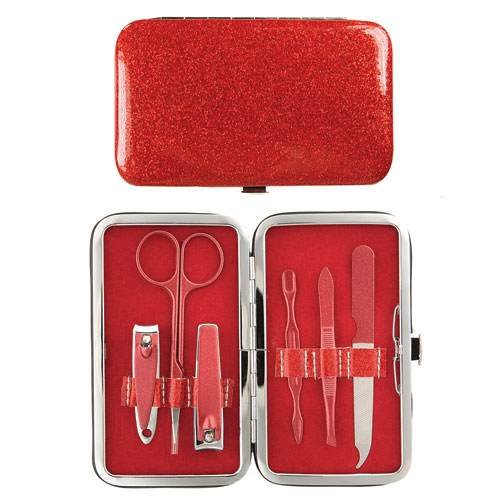 The holidays mean bling and we've done our part with this sensational glitter manicure set! Classic red case contains 6-piece manicure set with nail file, tweezers, cuticle tool, trimming scissors, and 2 nail clippers. Color: Red Glitter Size: 2.75" x 4.5" x 0.5".
